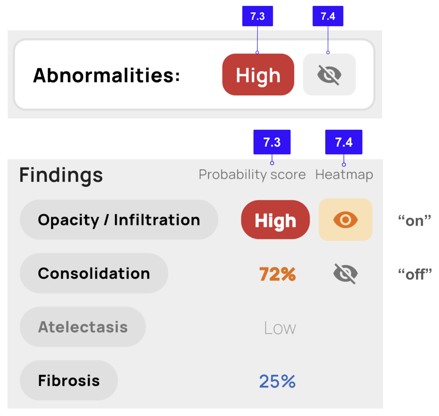 | High (พื้นหลังสีแดง) | ≥ 85% | แสดงข้อความ "High" พร้อมพื้นหลังสีแดง ![]() | AI มีความเชื่อมั่นสูงมากว่ามีความผิดปกตินั้นในภาพ ควรให้ความสนใจเป็นพิเศษและพิจารณาร่วมกับข้อมูลทางคลินิกอื่น |